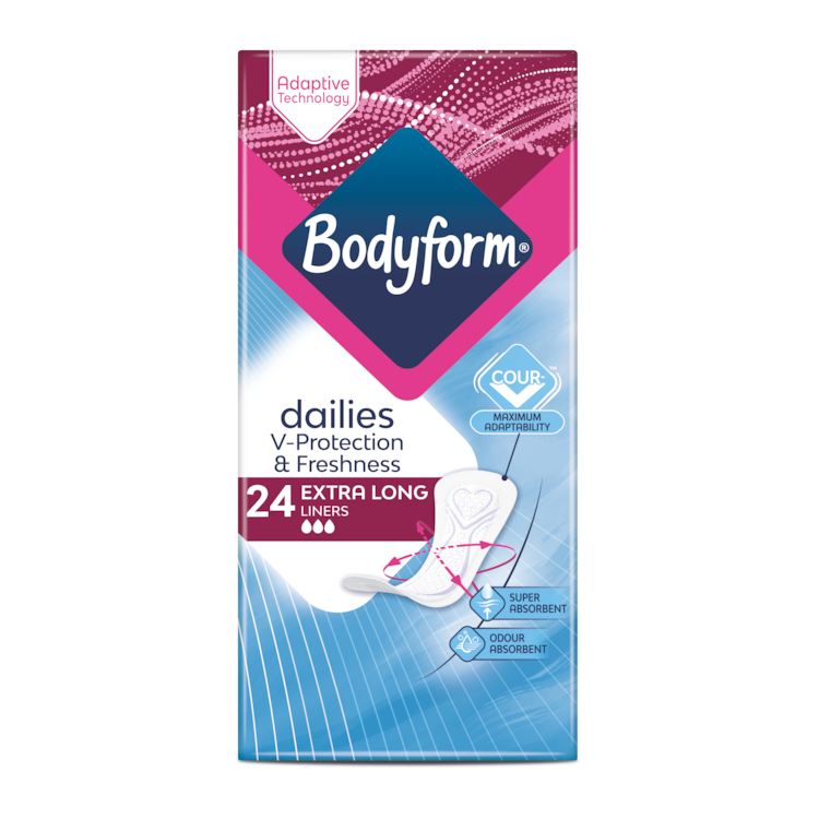 Bodyform Extra Long Daily Fresh Liners have CurveFit technology, making them more flexible and absorbent.