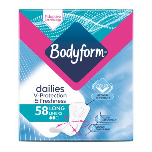 Bodyform Extra Long Daily Fresh Liners have CurveFit technology, making them more flexible and absorbent.