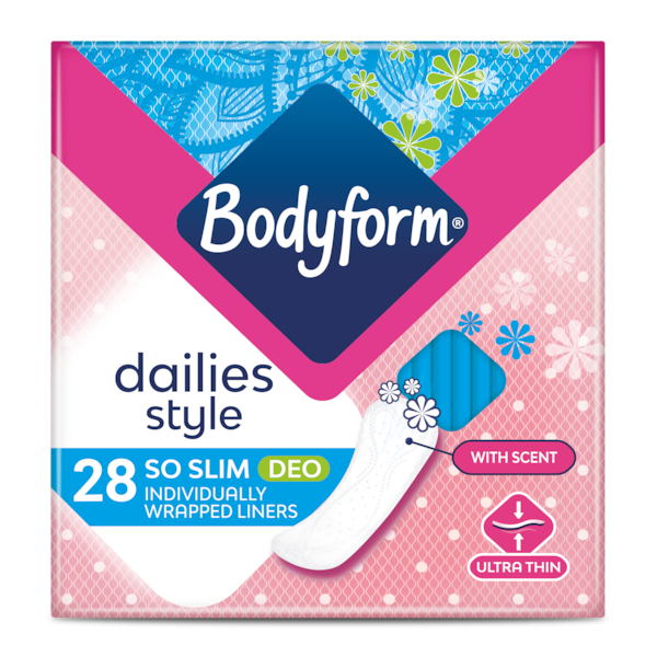 Bodyform So Slim Deo Liners are slim enough to wear with anything, individually wrapped and lightly scented to keep you fresh and confident all day.