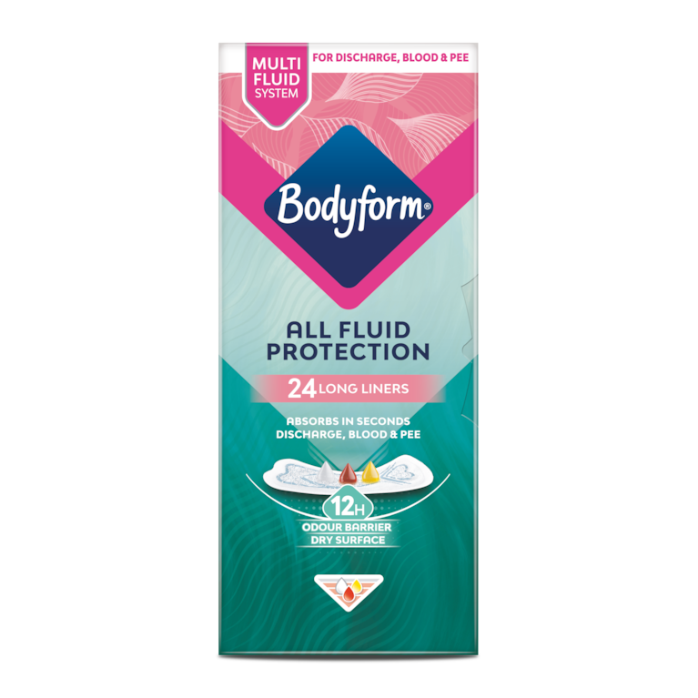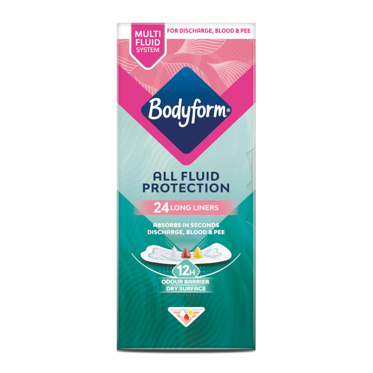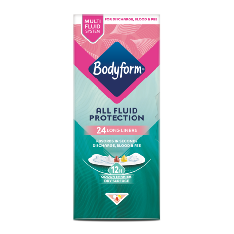 Bodyform All Fluid Protection liners help keep you dry and confident. These panty liners are 2.5 cm longer than normal length liners and provide you with powerful protection from all fluids, no matter if it's discharge, blood or pee.
